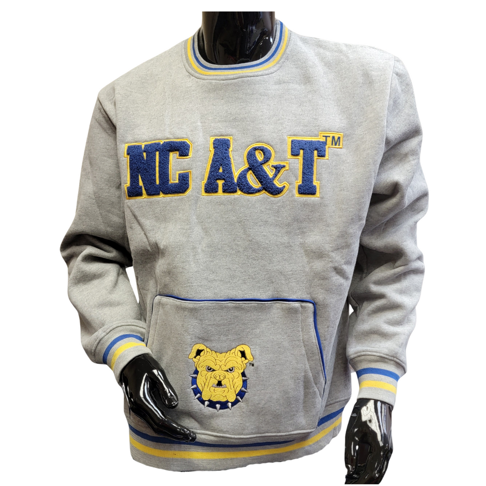 Sweatshirt showcasing embroidered chenille letters, crew neckline